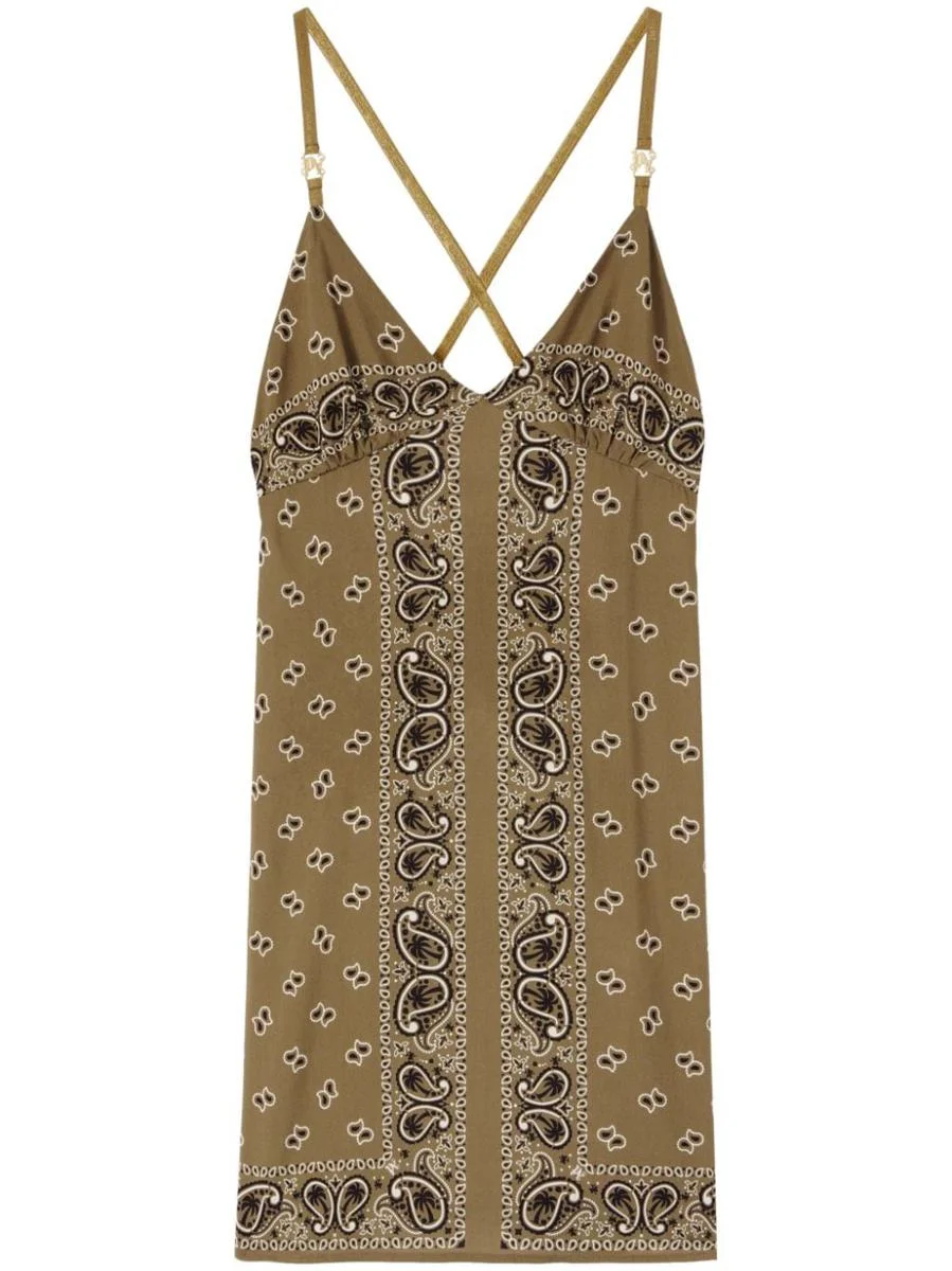 This slip dress from Palm Angels is adorned with a neutral-inspired iteration of the paisley print in khaki, black and off-white hues. It's cut with a V-neck with slender straps that crisscross at the back before falling to a slightly flared, thigh-length skirt. Made in Italy Highlights khaki paisley print V-neck adjustable spaghetti straps rear criss-cross straps thigh-length straight hem Gender: Women Material: FABRIC 100% VISCOSE Color: MILITARY MILITARY Made in: Imported Product ID: PWDJ007S24FAB001 5656 MILITARY MILITARY *Import tax/duty will be calculated at checkout (If applicable)