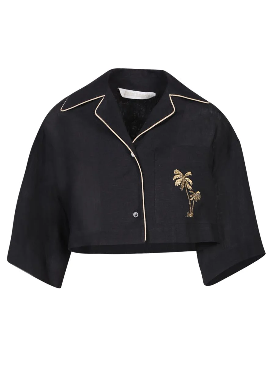 Linen shirt by Palm Angels Bowling neck. Front button fastening. Short sleeves. Logo on the chest. Gender: Women Material: 100% LINEN Color: Black Made in: Imported Product ID: PWGG003S24 FAB005 1076 *Import tax/duty will be calculated at checkout (If applicable)
