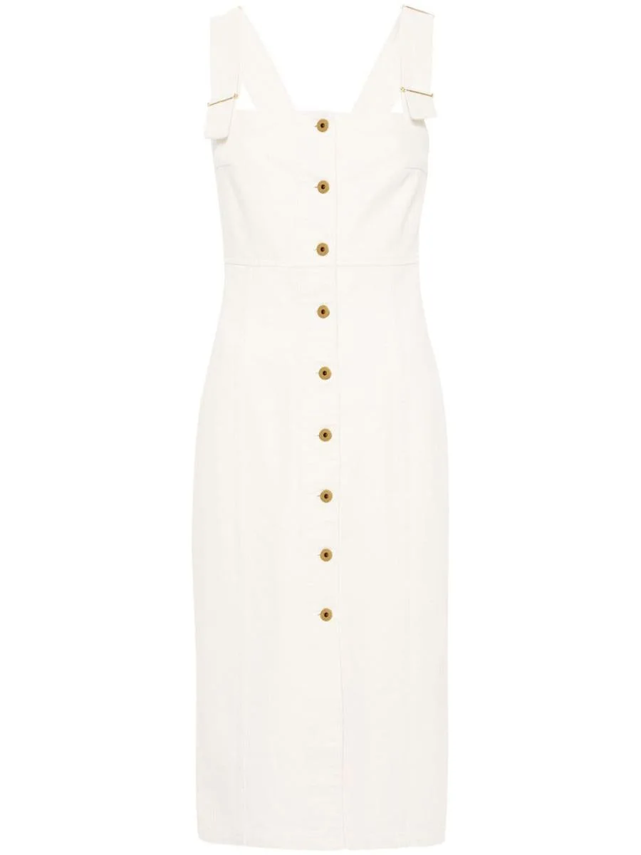 light beige cotton denim square neck sleeveless two adjustable shoulder straps seam detailing central rear vent internal logo tag mid-length straight hem front button fastening Gender: Women Material: COTTON 100 % Color: BEIGE Made in: TN Product ID: DR134 0178 008N *Import tax/duty will be calculated at checkout (If applicable)
