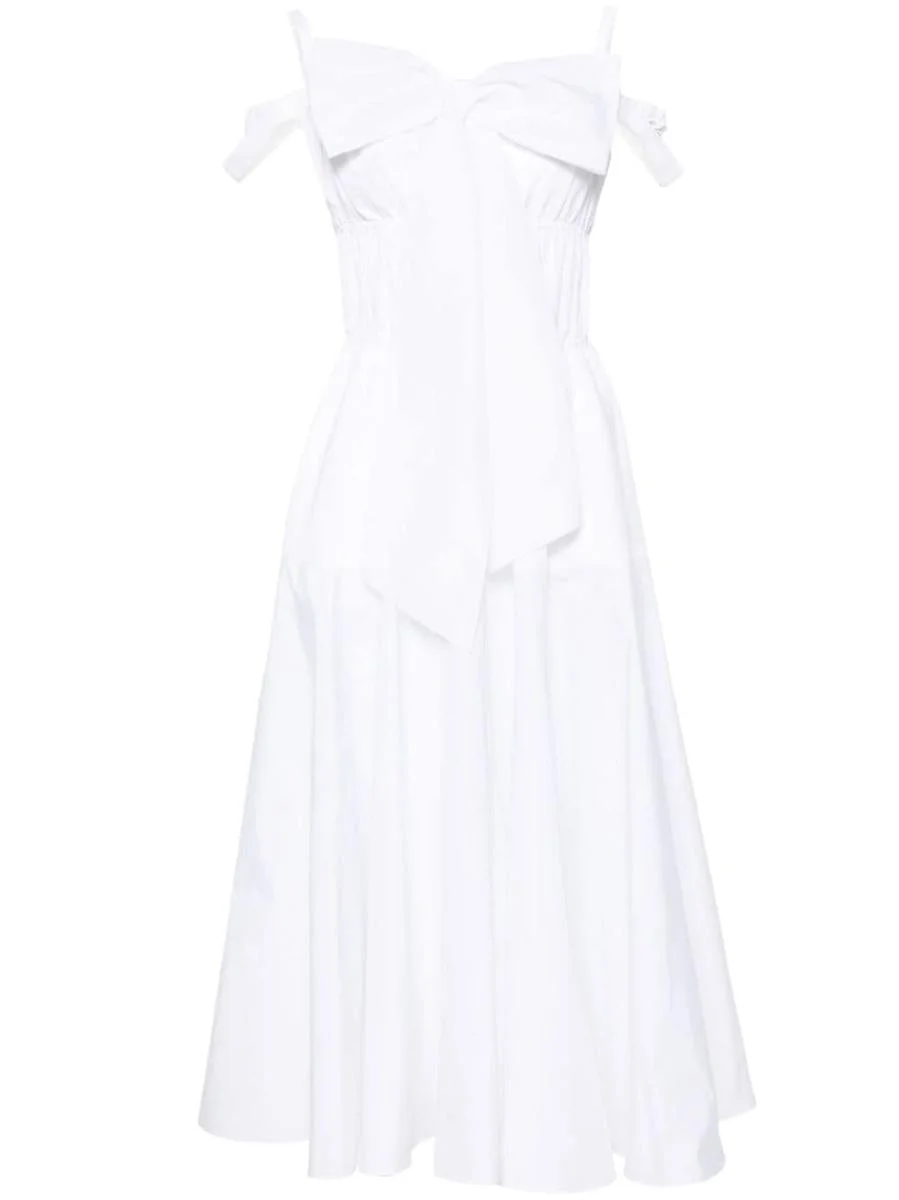 white recycled polyester faille oversize bow detail elasticated trim off-shoulder adjustable spaghetti straps sleeveless elasticated tiered bodice flared skirt straight hem mid-length unlined This item is made from at least 50% recycled or upcycled materials. For recycled synthetic clothing products, we highly recommend using a microfibre-catching washing bag to ensure that no microplastics that can pollute water are released in the process. Learn more about what makes a product Conscious on our Conscious Criteria page Gender: Women Material: POLYESTER 100% Color: WHITE Made in: PL Product ID: DR133 0011 001W *Import tax/duty will be calculated at checkout (If applicable)