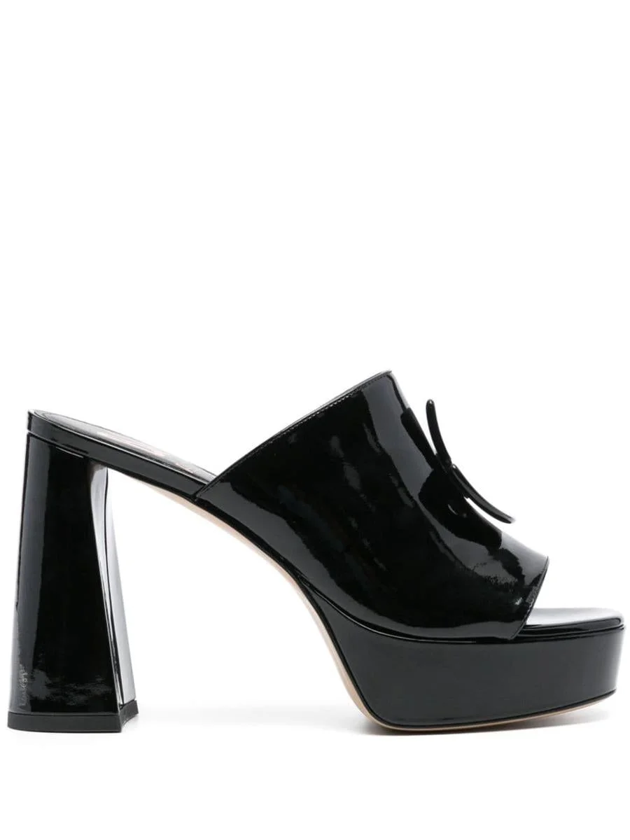 black calf leather patent finish almond open toe front strap with logo appliqué branded leather insole 115mm high block heel platform sole slip-on style Gender: Women Material: OUTER LEATHER 100 % ; LINING LEATHER 100% ; SOLE LEATHER 100% Color: BLACK Made in: IT Product ID: SS24102 BLACK *Import tax/duty will be calculated at checkout (If applicable)