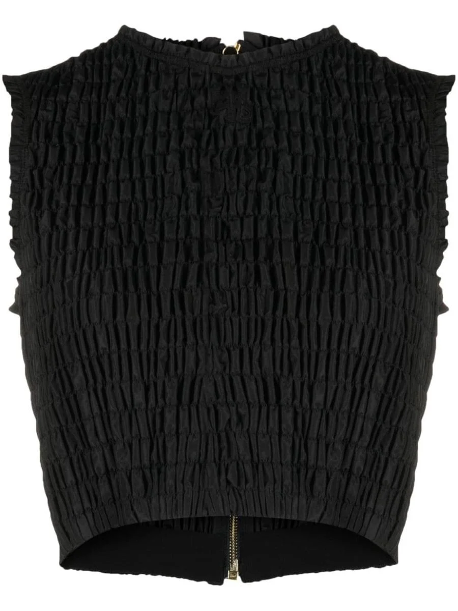 smock-detail crop top from Patou featuring smocking details, rear zip fastening, straight hem, black, round neck, sleeveless and cropped. Gender: WOMEN Material: POLYESTER 100% Color: BLACK Made in: MG Product ID: TO0370011 999B *Import tax/duty will be calculated at checkout (If applicable)