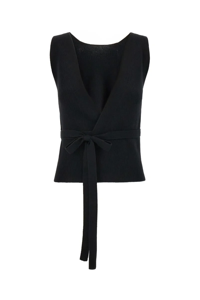ribbed-knit wrap top from Patou featuring black, wool blend, ribbed knit, wrap design, V-neck, sleeveless, side tie fastening and straight hem. Gender: Women Material: MERINO WOOL 88% POLYAMIDE 11% ELASTAE 1% Color: BLACK Made in: TR Product ID: KN1538040 999B *Import tax/duty will be calculated at checkout (If applicable)