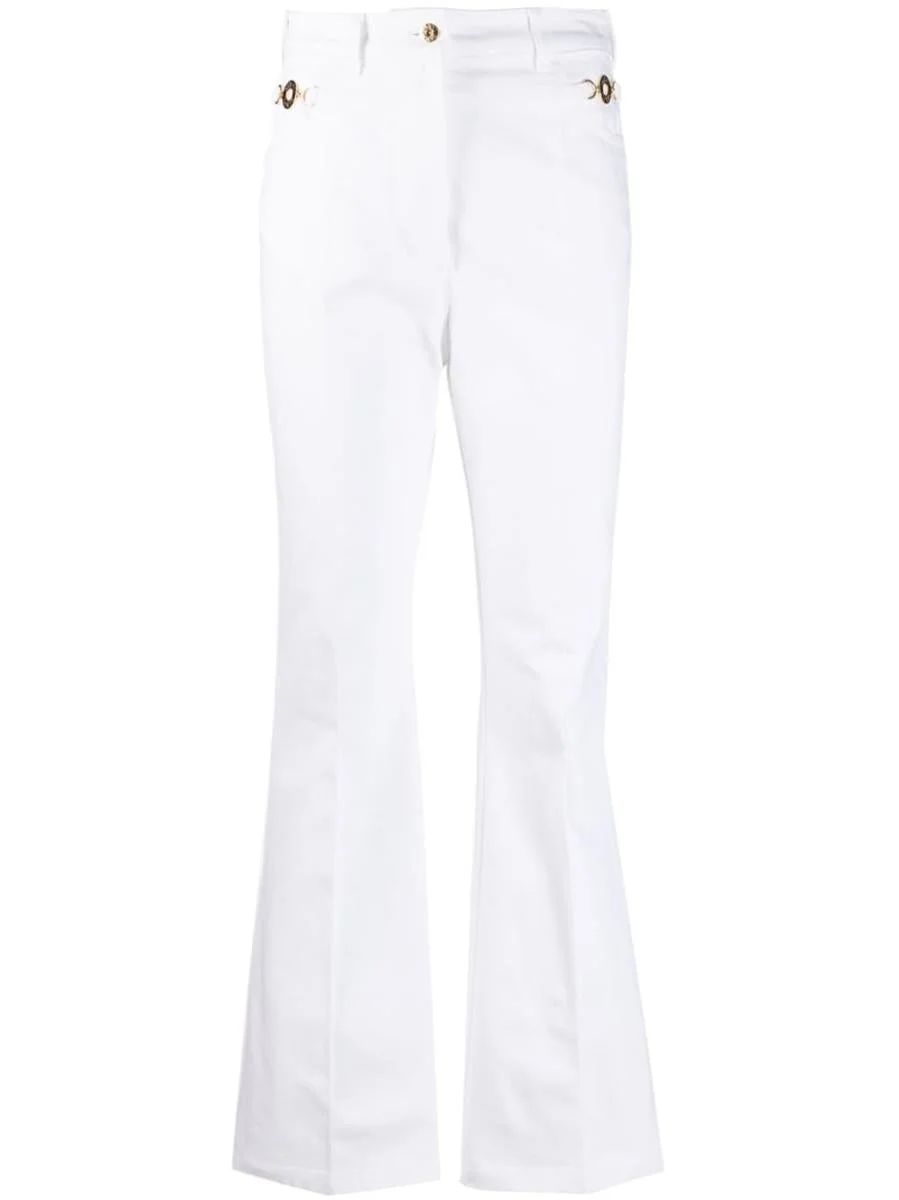 high-rise flared jeans from Patou featuring white, cotton, denim, logo plaque, gold-tone hardware, pressed crease, belt loops, front button and zip fastening, embroidered logo, slip pockets to the sides and flared cuffs. Gender: Women Material: COTTON 100 % Color: WHITE Made in: TN Product ID: TR030 0081 001W *Import tax/duty will be calculated at checkout (If applicable)