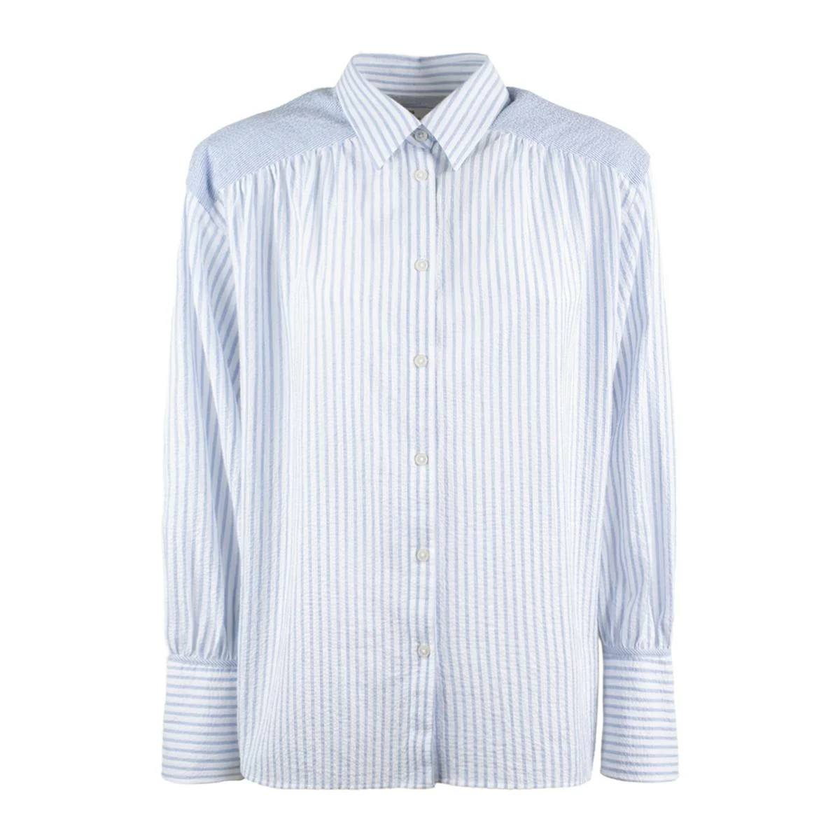 Item Color: White and light blue | Made from a cotton blend, this blue pinstripe seersucker blouse features a contrasting stripe pattern on the shoulders, collar, and cuffs | The long-sleeved design is complemented by tone-on-tone button plackets along the flap and slightly oversized cuffs that add a distinctive modern touch | Ideal for enhancing smart-casual outfits with its unique blend of structure and relaxed style | Composition: 99% Cotton, 1% Elastane Gender: Women Material: COTTON, SYNTHETICS Color: LIGHT BLUE, WHITE Made in: Italy Product ID: W2R-333B-P31294-01 *Import tax/duty will be calculated at checkout (If applicable)
