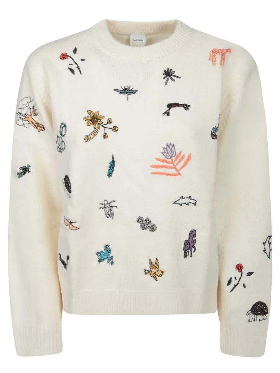Long-sleeve knitted sweater. Colorful embroidered design featuring natural elements. Ribbed finishes at collar, cuffs, and hem. Explore a touch of nature with PAUL SMITH's finely crafted soft-knit sweater. Each detailed embroidery enhances a sophisticated expression of style and comfort. Gender: Women Material: 100% WOOL Color: WHITE Made in: Imported Product ID: W1R645N T11198 02 *Import tax/duty will be calculated at checkout (If applicable)