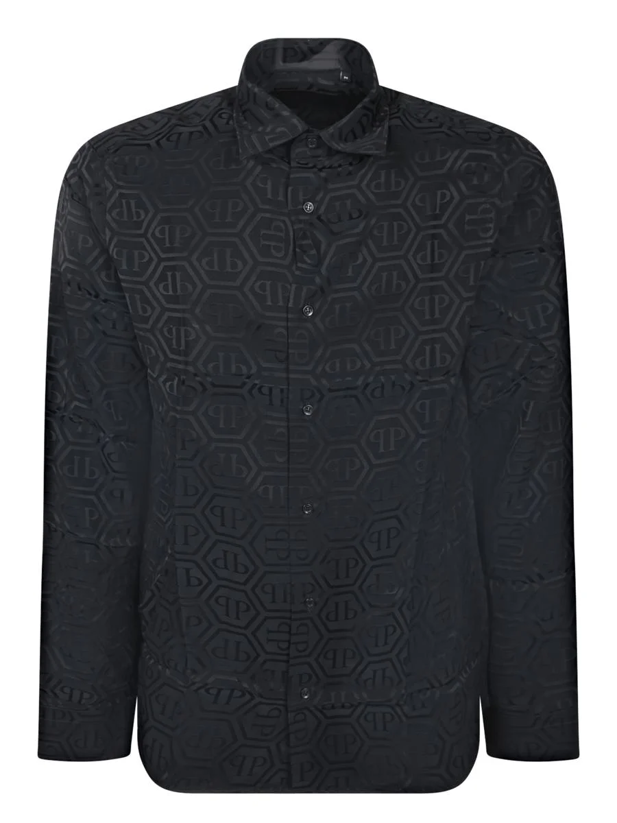 Long sleeve shirt in pure silk. Classic collar. Front button closure. All-over monogram pattern. Elegant PHILIPP PLEIN black silk shirt, featuring an exclusive monogram print that adds a touch of distinguished sophistication. Perfect for formal events or classy evenings. Gender: Men Material: 100% VISCOSE Color: Black Made in: Imported Product ID: MRP2488 PTE104N 02 *Import tax/duty will be calculated at checkout (If applicable)