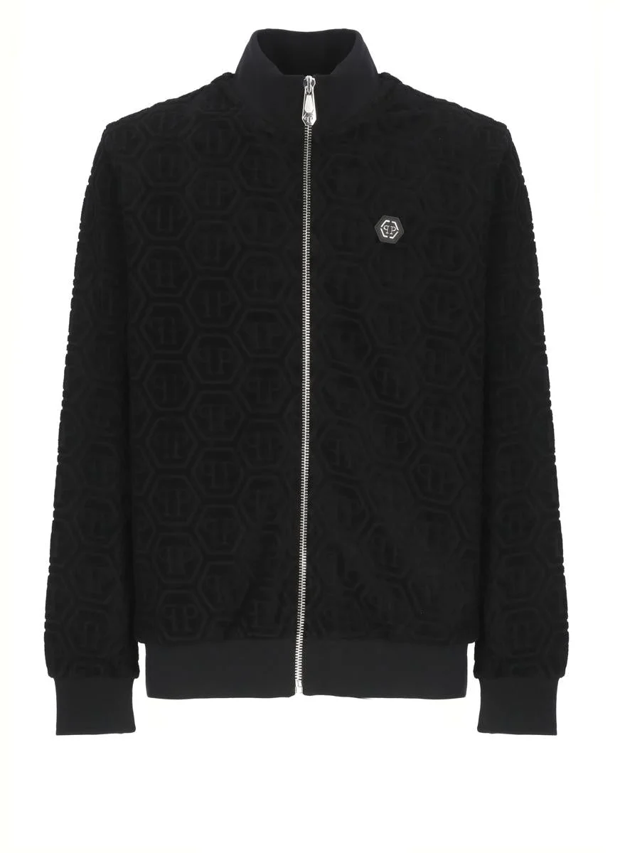 - Black Philipp Plein cotton sweatshirt for man - All-over tone on tone monogram - High neck - Long sleeves - Front patch with meta logo - Two front slit pockets - Front zip fastening Model's height is 190 cm and he wears a size L Gender: Men Material: 100% COTTON Color: Black Made in: Imported Product ID: FAECMJB3769PTE021N02 *Import tax/duty will be calculated at checkout (If applicable)