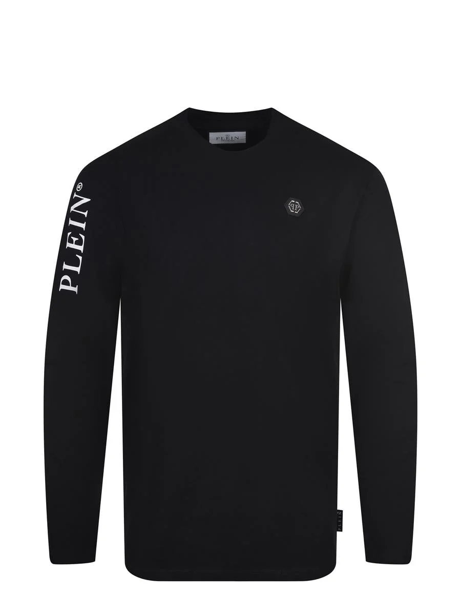 Philipp Plein sweater made of black cotton. Sleeves. Ribbed crew neck. Embossed logo on the chest. Contrasting logo lettering printed on the sleeve. Gender: Men Material: 100% COTTON Color: Black Made in: TR Product ID: MTK7781PJY002N-02 *Import tax/duty will be calculated at checkout (If applicable)
