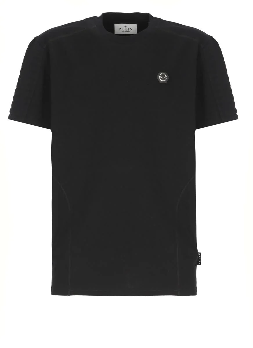 - Black Philipp Plein cotton t-shirt for man - Crew neck - Short sleeves - Front contrasting color metal logo Model's height is 190 cm and he wears a size L Gender: Men Material: 100% COTTON Color: Black Made in: Imported Product ID: FAECMTK8506PJY002N02 *Import tax/duty will be calculated at checkout (If applicable)