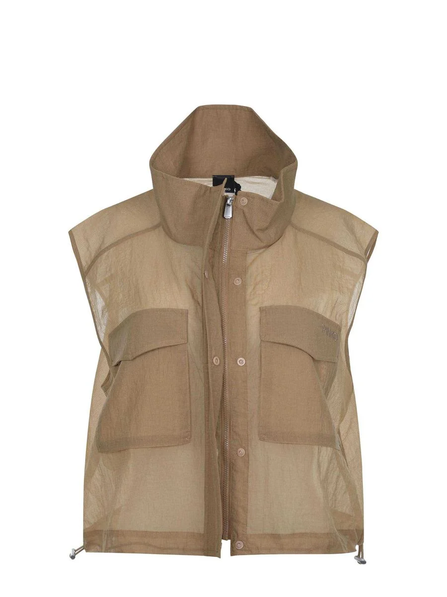 Pinko 'Accordion' vest made of tobacco-colored nylon. Sleeveless. High collar. Transparent. Water-repellent. 'Pinko' logo lettering on the left pocket. Applied patch pockets on the front with snap buttons. Adjustable drawstring at the bottom. Closure with a zip hidden by a flap with snap buttons. Gender: Women Material: 100% NYLON Color: BROWN Made in: Imported Product ID: 104852-A2EKC82 *Import tax/duty will be calculated at checkout (If applicable)