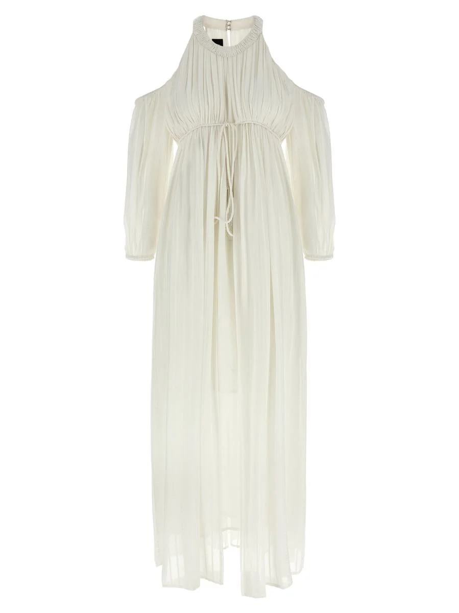 'Allenatore' viscose georgette dress with tone-on-tone satin stripes, American neckline embroidered with beads with back hook closure and cut-out teardrop detail, front lacing closure with tassels decorated with beads and cut-out teardrop detail, off the shoulder model with long sleeves with elastic cuffs, front split, petticoat Gender: Women Material: 100% VISCOSE Color: WHITE Made in: IN Product ID: 104848A2GYZ05 *Import tax/duty will be calculated at checkout (If applicable)
