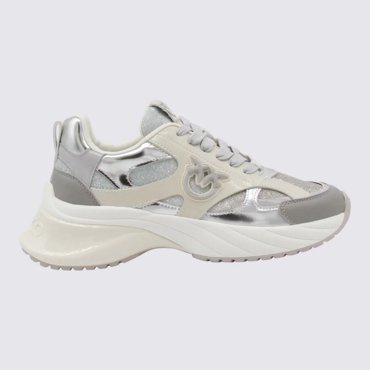 Beige and silver sneakers from Pinko featuring round toe, silver tone details, lateral logo and rubber sole. Size Type: Shoes Woman IT Gender: Women Material: COVER TEX/LE SOLE 100% ELASTANE Color: SILVER Made in: Imported Product ID: SS0067E032ZZF *Import tax/duty will be calculated at checkout (If applicable)