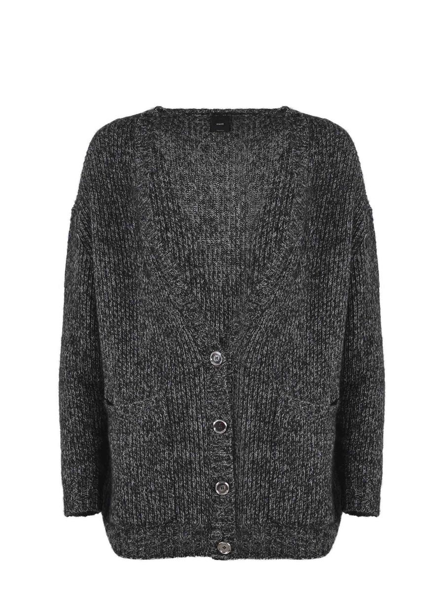 Cardigan Pinko "Erbaceo" made of mouline wool and alpaca blend in Anthracite Grey. Rib-knit. V-neck. Long sleeves. Low armhole. Patch pockets on the sides. Button closure, front. Gender: Women Material: MISTO NYLON E ALPACA Color: Grey Made in: IT Product ID: 104115-A247KZZ *Import tax/duty will be calculated at checkout (If applicable)
