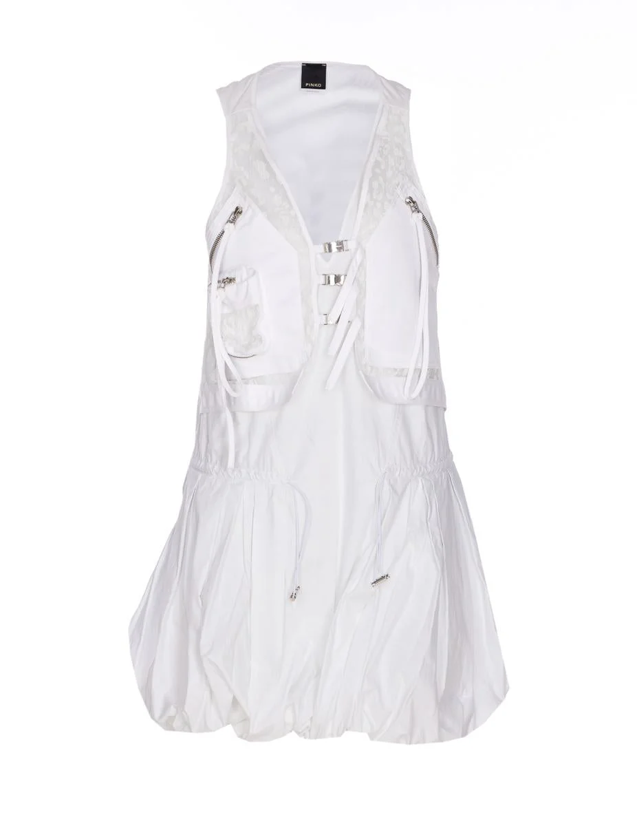 Pinko White Benny Dress, V-Neck, Buckle Closure On The Front, Sleeveless, Transparent Effect, Coulisse On Waist, Mini Model, EU SIZE (IT) Gender: Women Material: 100% COTTON, 100% POLYESTER Color: WHITE Made in: Imported Product ID: 105305A2MOZ04 *Import tax/duty will be calculated at checkout (If applicable)