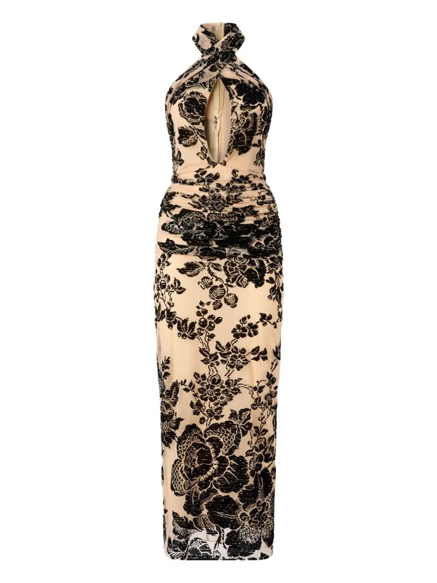Back invisible zip closure Halter neckline with twisted front and cut-out detail; sleeveless Gathered detailing at waist Contrasting all-over flocked tapestry print; devore effect Warpless tulle fabric Nude color 85% Polyamide, 15% Elastane Made in Albania Gender: Women Material: 85% POLYAMIDE, 15% ELASTANE Color: Beige Made in: Imported Product ID: 105603A2QDNZ8 *Import tax/duty will be calculated at checkout (If applicable)