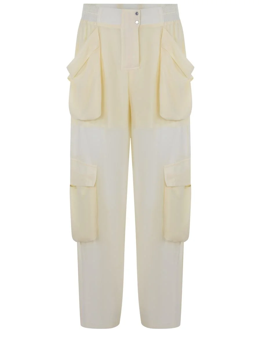 Pinko "Sottocasa" trousers made of light yellow polyester. Entirely semi-transparent. Lined at the top. Cargo model. Maxi patch pockets on the sides. Large pockets with flaps on the legs. Back flap pockets. Elastic drawstring at the back at the waist adjustable. Closure on the front with press studs and hidden zip. Gender: Women Material: 100% POLYESTER Color: GIALLO CHIARO Made in: IT Product ID: 104751-A21D22 *Import tax/duty will be calculated at checkout (If applicable)
