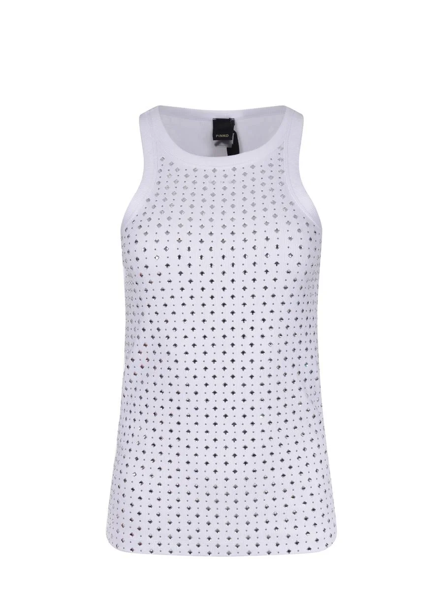 Pinko tank top made of white cotton blend. Crew neck. Thin straps. Pattern of small round studs and rhinestones on the front. Gender: Women Material: COTTON Color: WHITE Made in: Imported Product ID: 105928-A2XYZ04 *Import tax/duty will be calculated at checkout (If applicable)