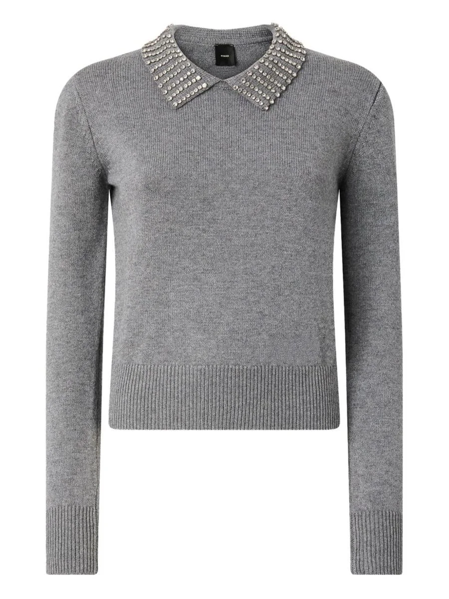 Pinko 'Ventotene' sweater with collar and rhinestones Gender: Women Material: .48% NYLON 27% VISCOSE 20% WOOL 5% CASHMERE Color: GREY Made in: Imported Product ID: 105530 A2S4 VENTOTENE II2 *Import tax/duty will be calculated at checkout (If applicable)