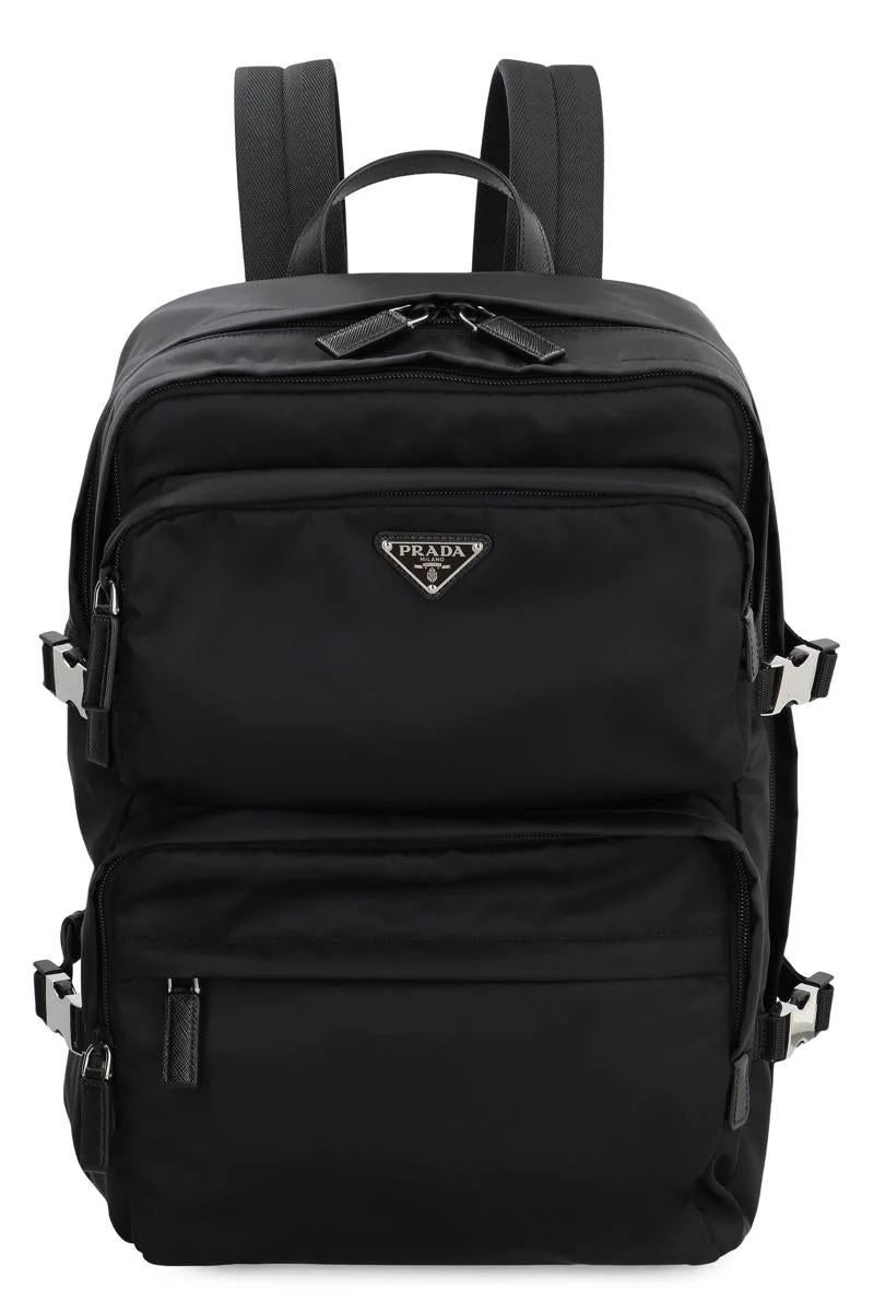 PRADA BACKPACK WITH TOP HANDLE FOR EASY CARRYING. THE ICONIC TRIANGULAR LOGO PLAQUE IS APPLIED TO THE FRONT, WHILE PADDED AND ADJUSTABLE SHOULDER STRAPS OFFER COMFORT AND ADJUSTABILITY. THE DESIGN IS ENHANCED BY THREE ZIPPERED POCKETS ON THE FRONT AND FOUR APPLIED BUCKLES ON THE SIDE PANELS, ADDING A TOUCH OF FUNCTIONAL STYLE. INSIDE, A SINGLE COMPARTMENT PROVIDES PRACTICALITY AND SPACE TO ORGANIZE ITEMS. UNI Gender: Men Material: NYLON Color: Black Made in: IT Product ID: 2VZ101VOOO2DMG_F0002 *Import tax/duty will be calculated at checkout (If applicable)