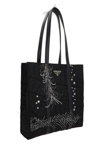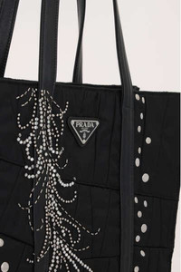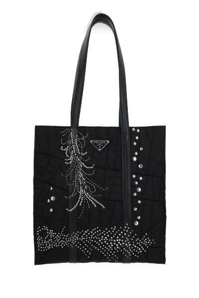 Prada's shopping bag crafted in black recycled nylon with patchwork motif refined by crystal and stud embellishments. It features silver-tone hardware and leather handles. Black logoed fabric-lined interior with two zip pockets. Gender: Women Material: 100%RECYCLED POLYAMIDE-100%CALF Color: Black Made in: IT Product ID: 1BG459VOO22CZMF0002 *Import tax/duty will be calculated at checkout (If applicable)