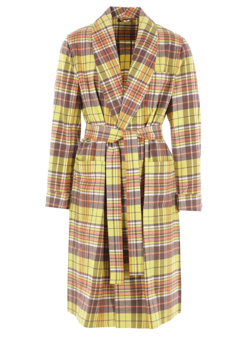 Prada robe-style coat made of check-patterned cotton flannel. Featuring shawl lapels, button closure, matching belt, front patch pockets, long sleeves with buttoned cuffs, and a straight hem. Unlined interior. Gender: Men Material: 100%COTTON-100%TROCHUS NILOTICUS Color: CREAM+COCOA Made in: Italy Product ID: VT8053SOOO170NF03GE *Import tax/duty will be calculated at checkout (If applicable)