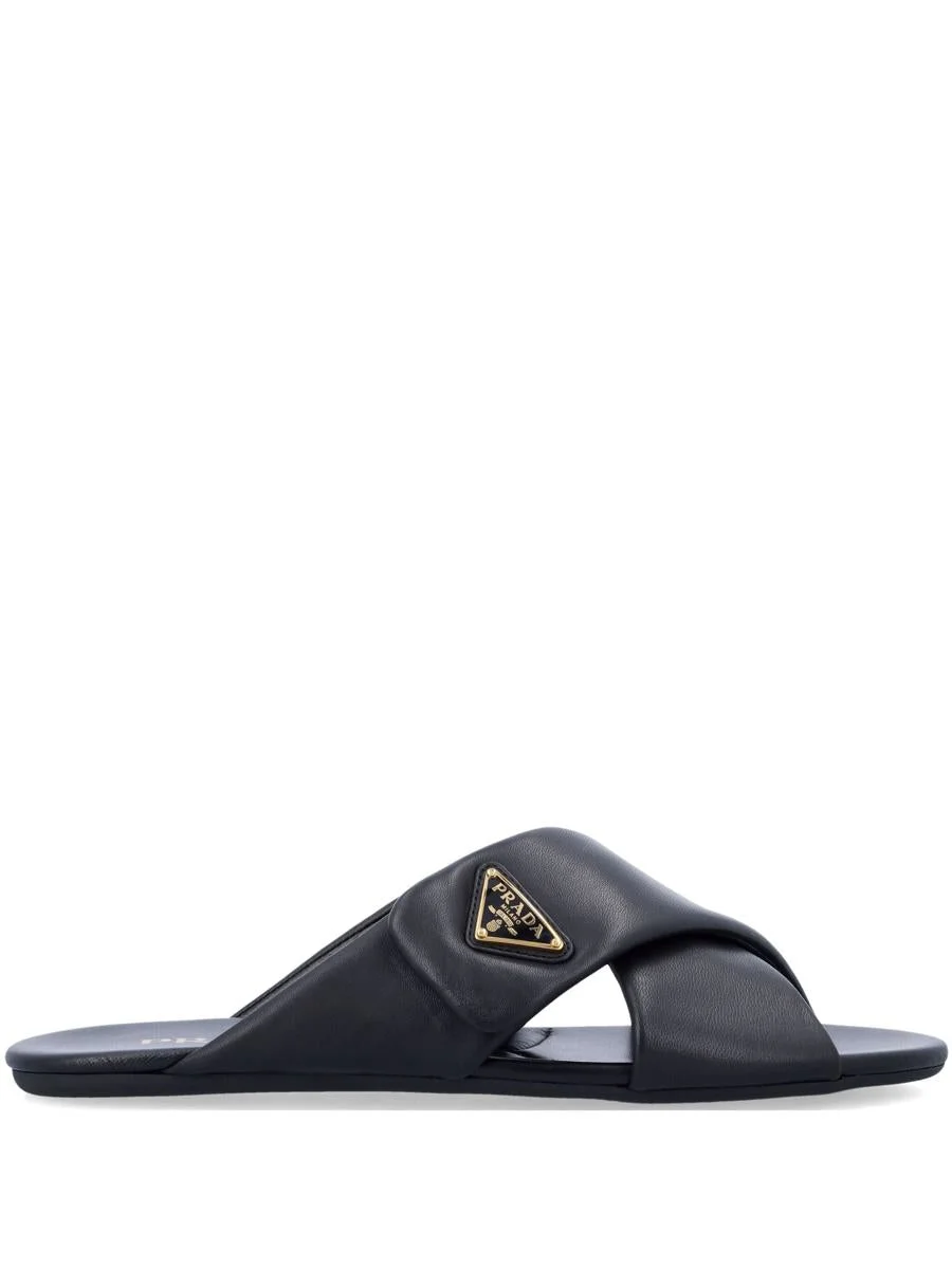 Highlights black open toe flat rubber sole enamel triangle logo   Composition Rubber 100%  Gender: Women Material: 100%LAMB Color: Black Made in: Imported Product ID: 1XX713F005ZHP F0002 NERO *Import tax/duty will be calculated at checkout (If applicable)