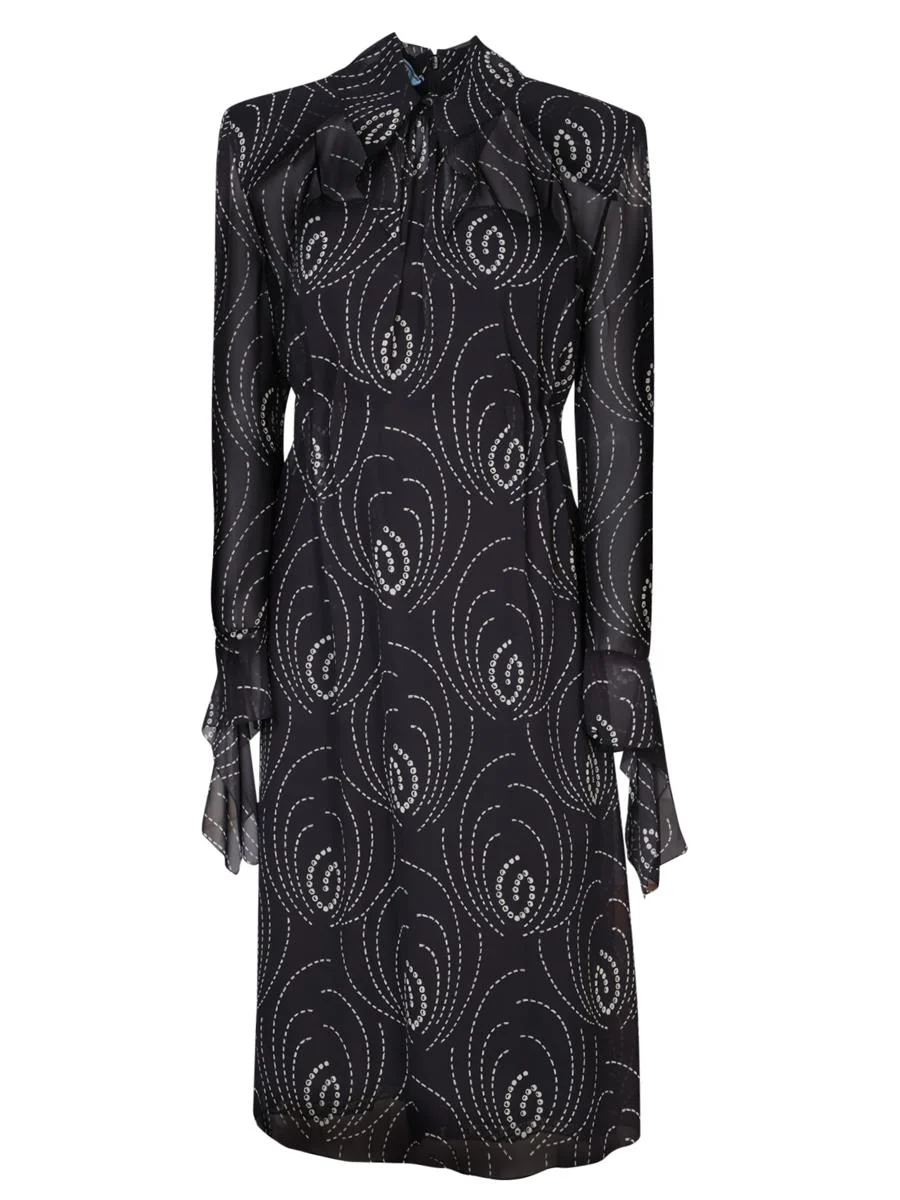 Midi dress by Prada. Long sleeves. Straight hem. All-over geometric print Gender: WOMEN Material: 100% POLYESTER Color: BLACK Made In: IMPORTED Product ID: P3M63 14VN F0002 *Import tax/duty will be calculated at checkout (If applicable)
