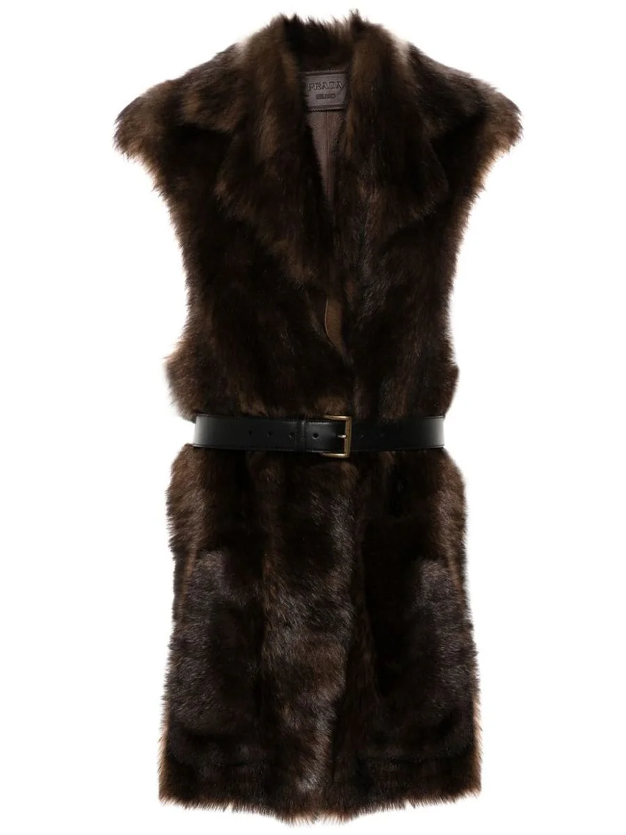 Highlights chocolate brown fur design notched lapels sleeveless detachable belt two front patch pockets leather lining straight hem hook fastening   Composition Sheep Skin/Shearling 100%   Gender: Women Material: 100%OVIS ARIES ARIES-100%CALF Color: MOGANO Made in: Imported Product ID: 59463SOOO15PF F0343 MOGANO *Import tax/duty will be calculated at checkout (If applicable)