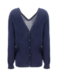 CASHMERE CARDIGAN FROM PRADA, FRONT BUTTON FASTENING, RIBBED CUFFS, V-NECK WITH RIBBED TRIM ON FRONT AND BACK, RIBBED HEM, MONOCHROME PATTERN, REGULAR FIT. RTW IT Gender: Women Material: KASHMIR *SOST CON WS* Color: BLEU Made in: Imported Product ID: P24G2GSOOO15DM_F0008 *Import tax/duty will be calculated at checkout (If applicable)