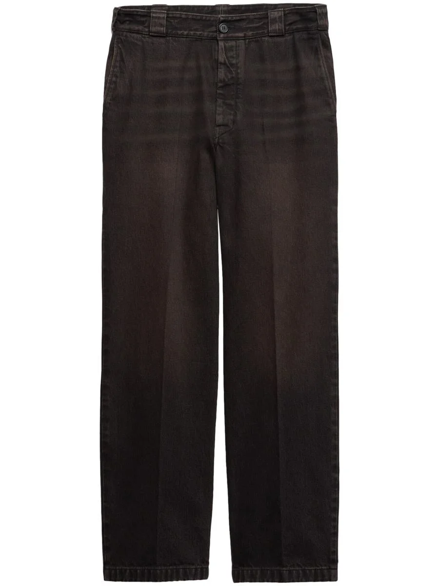Highlights coffee brown cotton denim dark wash whiskering effect at the thighs enamel triangle logo mid-rise belt loops pressed crease front button and zip fastening wide leg slip pockets to the sides side welt pocket two rear button-fastening jetted pockets Composition Cotton 100% Gender: Men Material: 100%COTTON Color: BROWN Made in: Imported Product ID: GEP272S182142D F0631 BROWN *Import tax/duty will be calculated at checkout (If applicable)