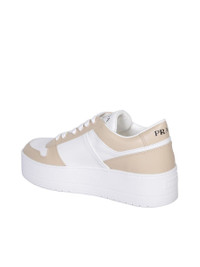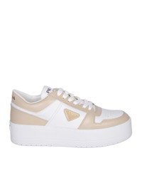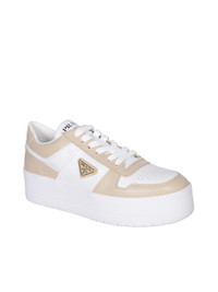 Leather platform sneakers. Two-tone design with golden triangular logo detail.. These Prada platform sneakers blend functionality and high-fashion style with a refined silhouette, softly balanced by beige and white hues, and enhanced by the sparkling golden logo Gender: Women Material: 100% LEATHER Color: WHITE Made in: Imported Product ID: 1E792M 3LPG F0P09 *Import tax/duty will be calculated at checkout (If applicable)