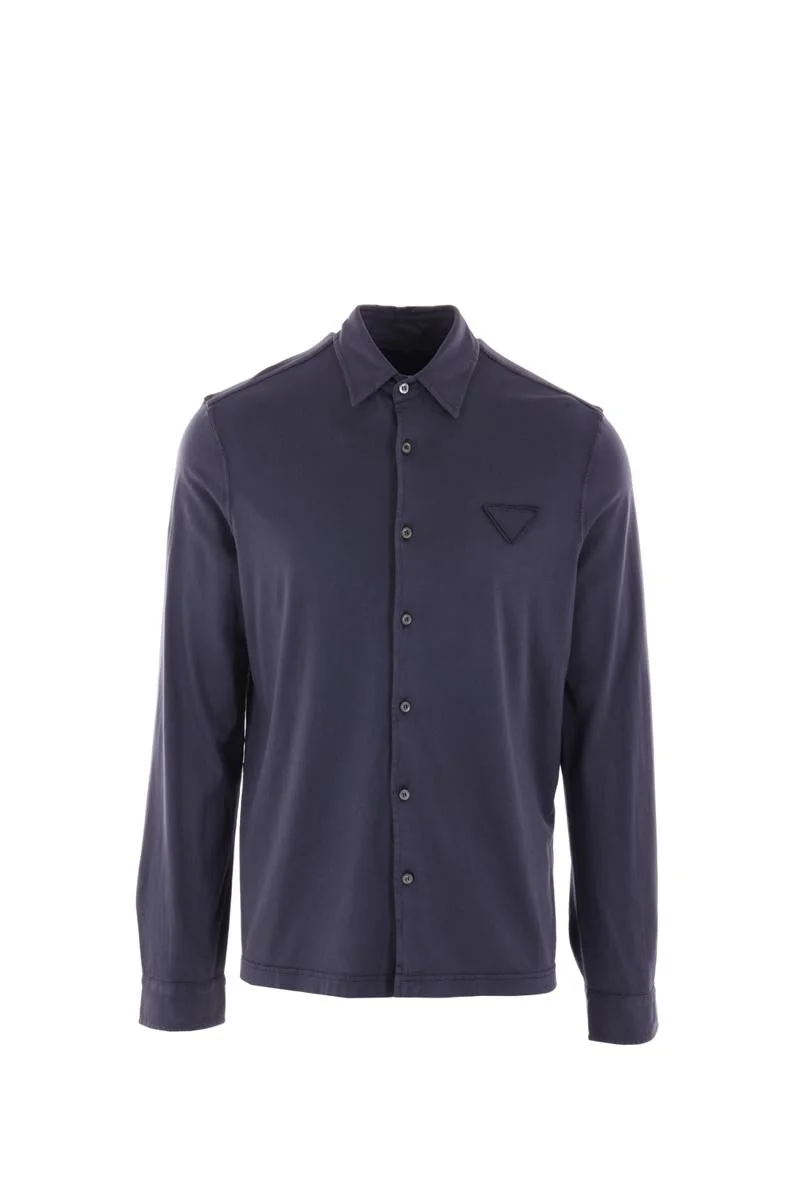 Prada shirt crafted in blue cotton jersey with the iconic triangle logo patch at chest. It features classic collar, button closure, long sleeves with buttoned cuffs and straight hem with small side slits. Gender: Men Material: 86%COTTON 14%POLYAMIDE-100%TROCHUS NILOTICUS Color: BLUE Made in: Italy Product ID: UJL92AS23213CCF0124 *Import tax/duty will be calculated at checkout (If applicable)