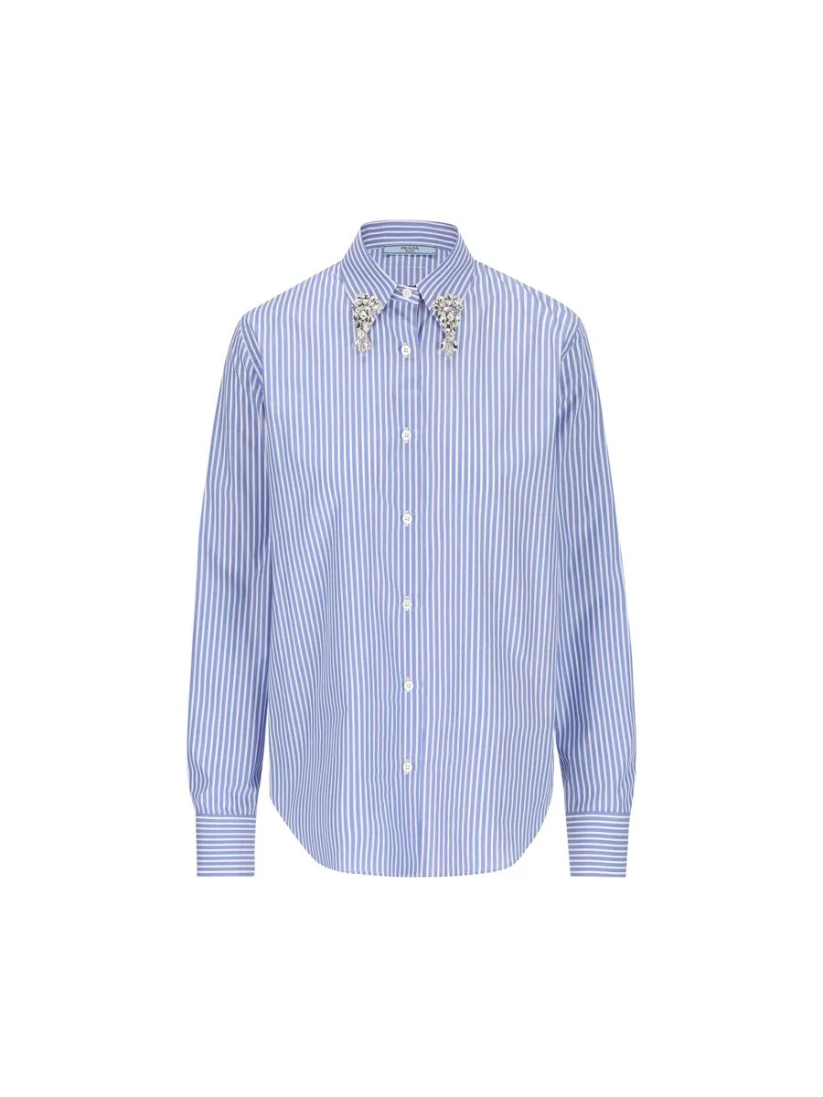 - Material: 100% cotton - Color: light blue - Other details: collar illuminated with delicate embroidery and triangle logo applique on back - Button closure - Made in Italy - Item number: P471HR155UF0013 Gender: Women Material: 100%COTTON-80%GLASS 20%BRASS-100% Color: AZURE SAPPHIRE Made in: IT Product ID: P471HR155UF0013_P25 *Import tax/duty will be calculated at checkout (If applicable)