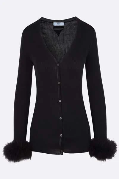 Prada's cardigan crafted in black ribbed silk knit. Featuring V-neckline, button closure, long sleeves with feathers at cuffs and ribbed edges. Gender: Women Material: 100%SILK-100%TROCHUS NILOTICUS-100%MELEAGRIS GALLOPAVO Color: BLACK Made in: IT Product ID: P25L63S23112DYF0002 *Import tax/duty will be calculated at checkout (If applicable)