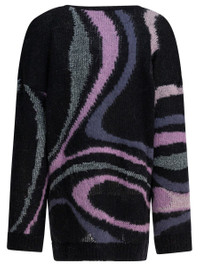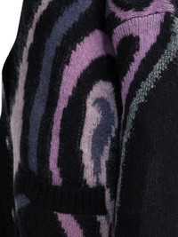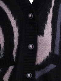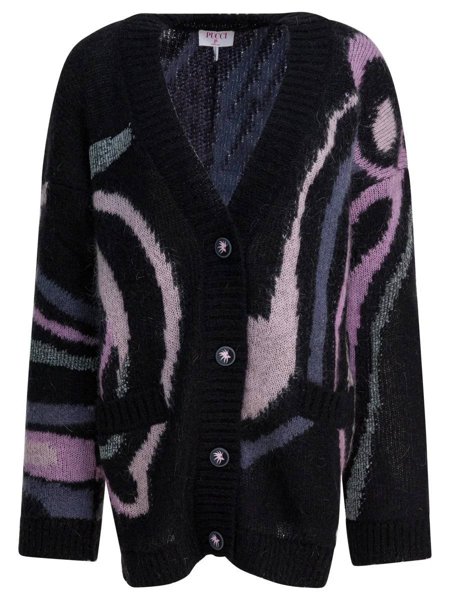 Marmo Pucci print cardigan with fine knit construction, made primarily of mohair, viscose, polyamide and wool. Regular-silhouette construction features a loose fit and fitted long sleeves. The pattern features a V-neck and front button closure. The seams are riveted and the fabric shows a continuous graphic pattern with no visible breaks. || - Marble all-over print - Long sleeves - V-neckline - Button closure - Oversize fit Extra Description: GraphicsOversized fit;Long sleeves PRINT PATTERNS MAY DIFFER SLIGHTLY Gender: Women Material: 62% MOHAIR 27% POLYAMIDE 6% VISCOSE 5% WOOL Color: Black Made in: Italy Product ID: 5UKQ815U967002 *Import tax/duty will be calculated at checkout (If applicable)