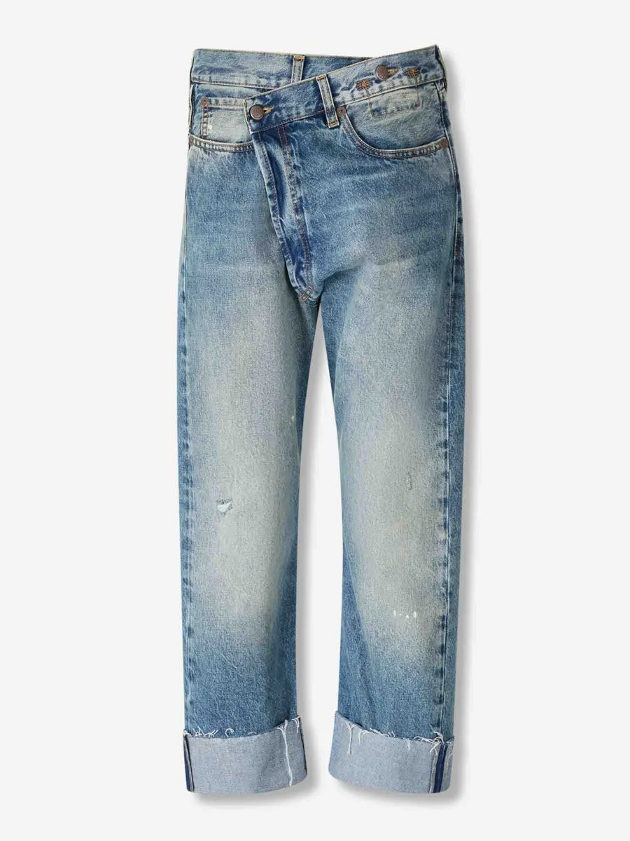 Wide Crossover JeansJeans By R13• Three front pockets and two back pockets• Mid-rise waist with belt loops• Contrast stitching details• Relaxed fit• Crafted from high-quality cotton denim, offering durability and a flawless finish• Frayed rolled straight hem• Front closure with asymmetrical diagonal metal buttonsComposition: 100% cottonMade in: Italy Gender: Women Material: 100% COTTON Color: DENIM BLUE Made in: Italy Product ID: R13W2048-D352A_JASPER *Import tax/duty will be calculated at checkout (If applicable)
