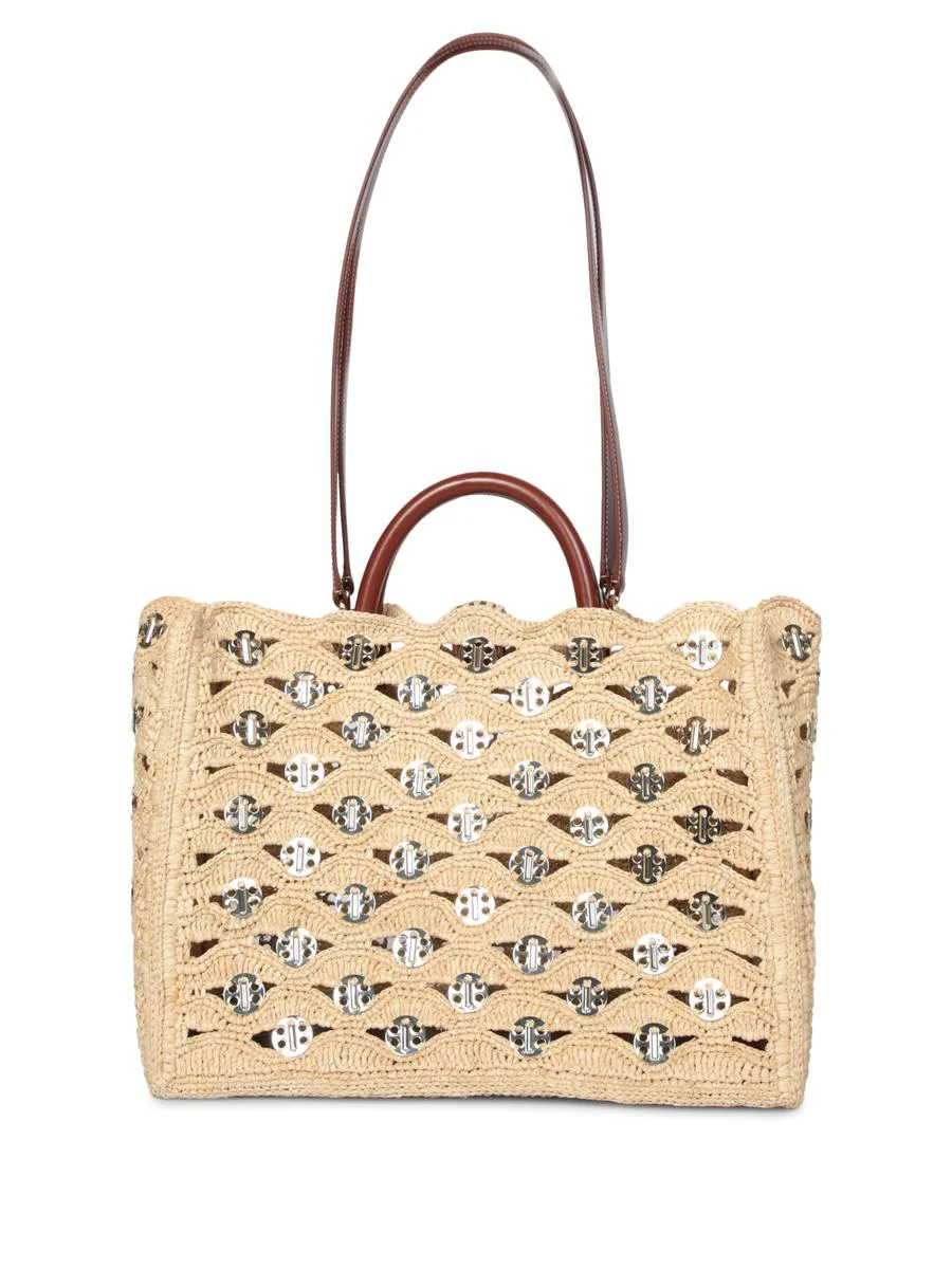Brown leather handles. Raffia weave with silver metal details. Open top closure.. This elegant Paco Rabanne shopper bag, crafted in natural raffia paired with iconic metal details, offers a sophisticated and spacious choice for any day Gender: Women Material: 90% RAFFIA 5% CALF LEATHER 5% BRASS Color: Beige Made in: Imported Product ID: 25PSS0501 NAT045 M227 *Import tax/duty will be calculated at checkout (If applicable)