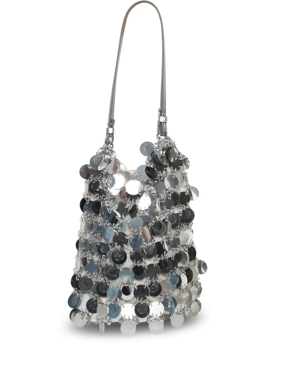 Shoulder bag with sparkling details. Unique design with metal coins and translucent discs. Silver metal strap.. A bold creation by Paco Rabanne, this shoulder bag blends contemporary elegance with a playful edge. Perfect for exclusive evenings or as a standout piece in a sophisticated daytime outfit Gender: Women Material: 90% PLASTIC 5% STEEL 5% BRASS Color: GREY Made in: Imported Product ID: 24PSS0433 PLX128 P040 *Import tax/duty will be calculated at checkout (If applicable)