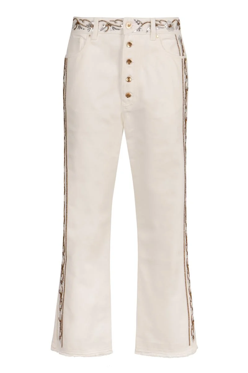 Cropped flared jeans Rhinestone details Frayed hem 100% Cotton Gender: Women Material: COTTON Color: WHITE Made in: Italy Product ID: 24FCPA382CO0526_P170 *Import tax/duty will be calculated at checkout (If applicable)