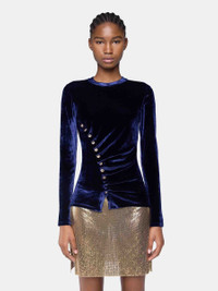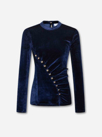 Draped Velvet TopRound neck top By Rabanne• Long sleeves with relaxed fit• Regular fit• Crafted in viscose and stretch polyamide velvet• Round neck top• 11 gold jewel snap button details• Long sleeveComposition: 77% viscose, 21% polyamide, 2% elastaneMade in: Portugal Gender: Women Material: 77% VISCOSE, 21% POLYAMIDE, 2% ELASTANE Color: COBALT BLUE Made in: Portugal Product ID: 25AJTO708VI0338_P432NAVY POSEIDON *Import tax/duty will be calculated at checkout (If applicable)