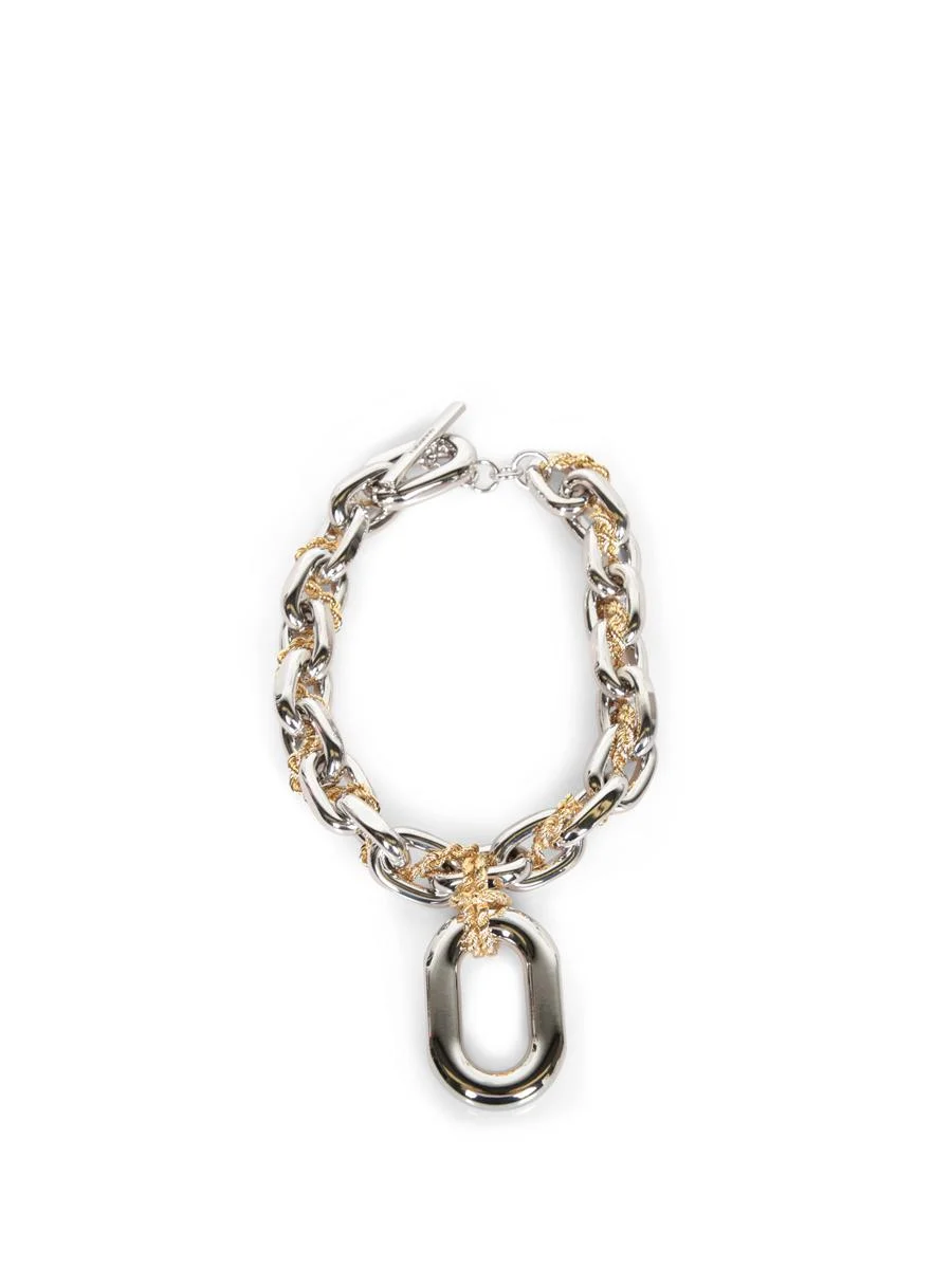 Necklace with wide silver links and gold details. Lobster clasp closure. This exquisite Paco Rabanne necklace features a sophisticated blend of silver links enhanced with intricate gold details, secured with an elegant lobster clasp closure. Gender: Women Color: GREY Made in: Imported Product ID: 25ABB0015 MET783 M089 *Import tax/duty will be calculated at checkout (If applicable)