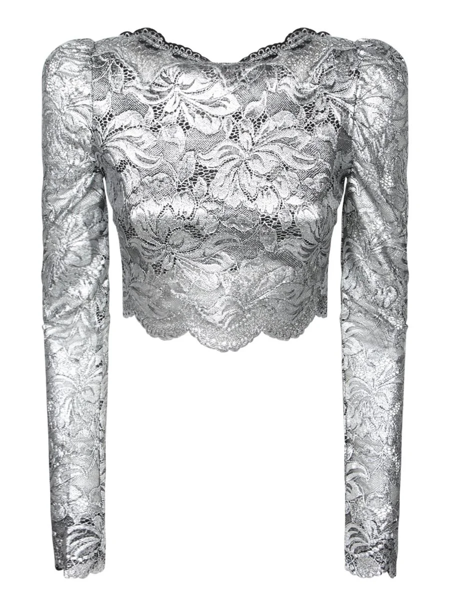 Long sleeves, coated lace fabric, sweetheart neckline. This Paco Rabanne silver lace crop top features an elegant sweetheart neckline and long sleeves, blending romantic style with a modern edge. Gender: Women Material: 90% POLYAMIDE 10% ELASTANE Color: GREY Made in: Imported Product ID: 25AJTO845 PA0244 V912 *Import tax/duty will be calculated at checkout (If applicable)