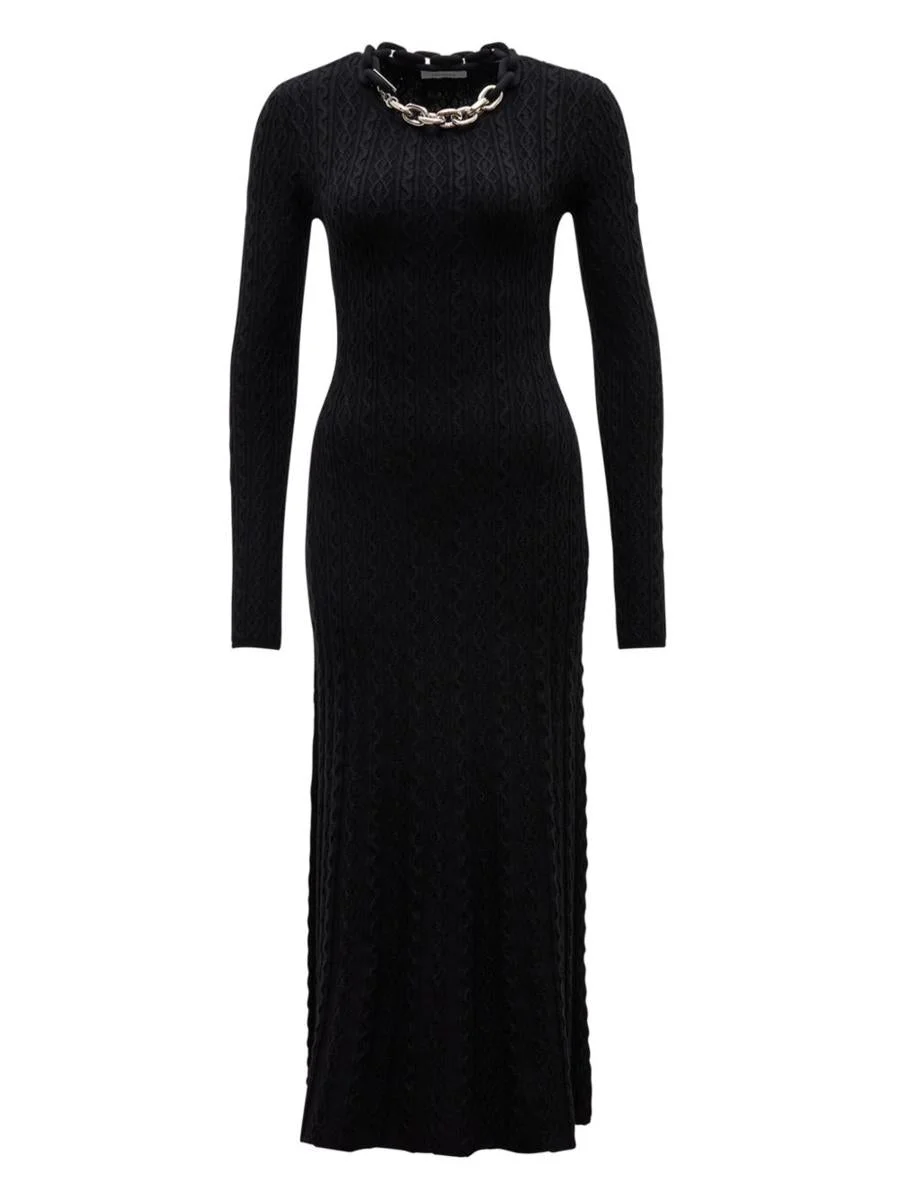 Ribbed crewneck; adjustable oversized fabric and gold-toned metal XL link chain detail at neckline Long sleeves, ribbed cuffs Slightly flared hem Textured mixed stitches stretch wool and cashmere knit design Fitted fit Black color 80% Wool, 10% Cashmere, 10% Elastane Made in China Gender: Women Material: 80% WOOL, 10% CASHMERE, 10% ELASTANE Color: Black Made in: Imported Product ID: 25AMRO154ML0320P001 *Import tax/duty will be calculated at checkout (If applicable)