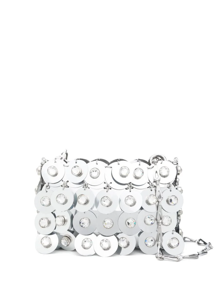 Silver-tone metallic knit shoulder bag from Rabanne featuring a concealed magnetic fastening, chain-link shoulder strap, full lining, and internal logo plaque. A bold and glamorous accessory, perfect for evening events or statement looks. SizeAndFit: 16x10x4 cm Gender: Women Material: SYNTHETIC->PLASTIC100.0 % Color: SILVER Made in: Imported Product ID: 25PSS0137PLX160 P040 *Import tax/duty will be calculated at checkout (If applicable)