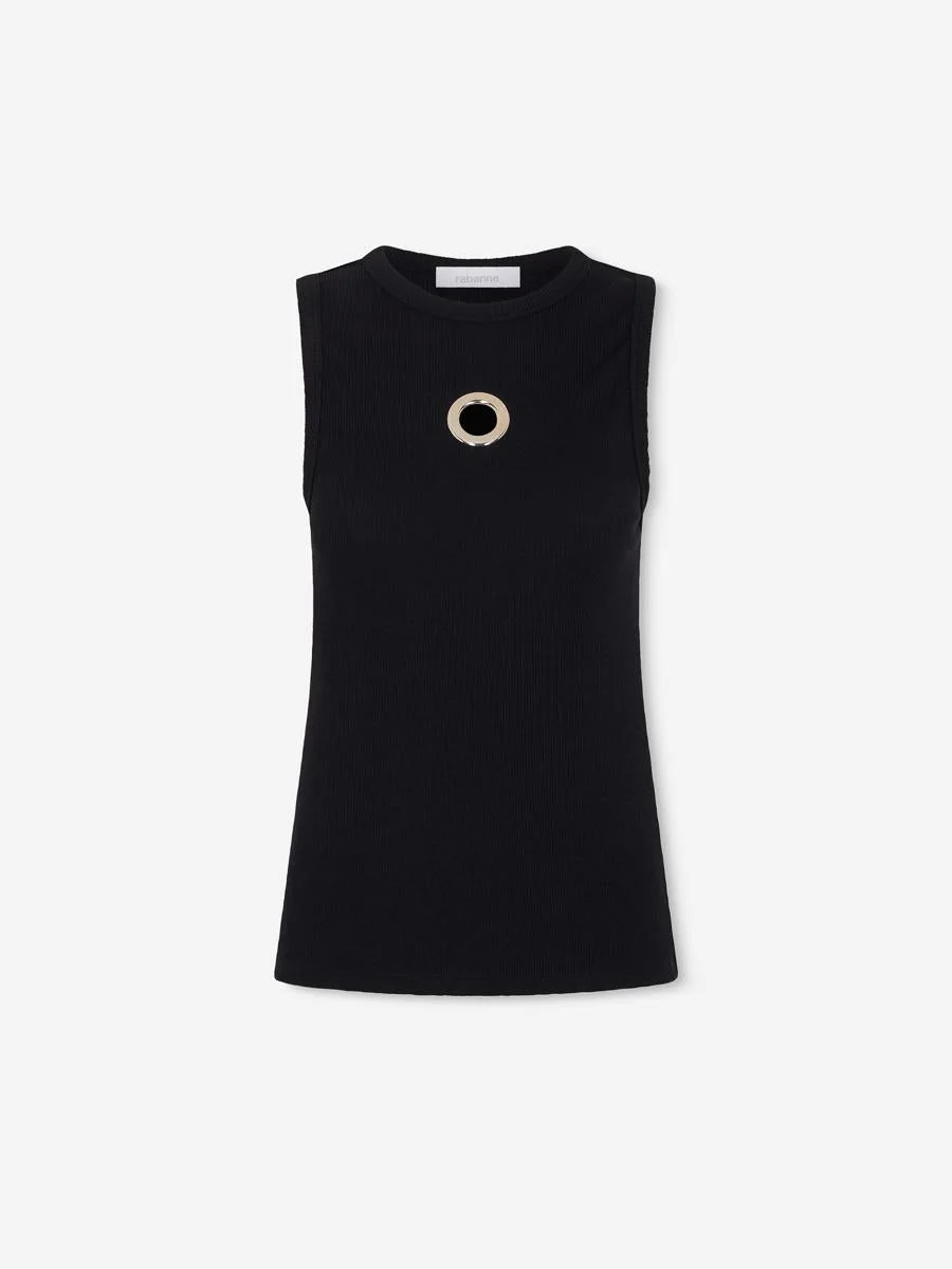 Sleeveless TopTop By Rabanne• Circular metal piece on the chest• Ribbed knit• Made from stretch cotton fabric• Round neck• SleevelessComposition: 97% cotton, 3% elastanePortugal Gender: Women Material: 97% COTTON, 3% ELASTANE Color: Black Made in: Portugal Product ID: 25HJTE027CO0530_P001BLACK *Import tax/duty will be calculated at checkout (If applicable)