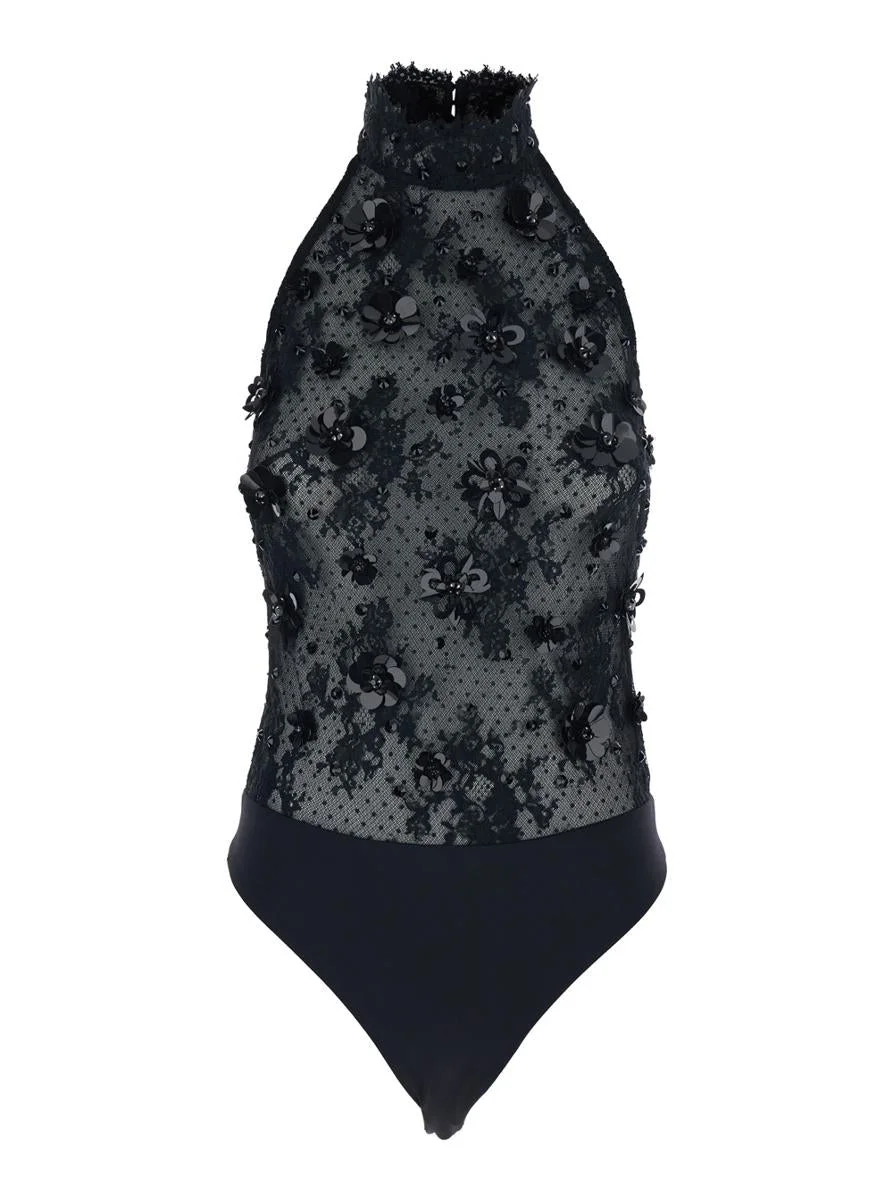 Bodysuit Black Halterneck Off-shoulder Sleeveless Rear closure Open rear All-over floral embroidery Sheer design Tech fabric Fitted shape Gender: Women Material: 100% NYLON Color: Black Made in: Imported Product ID: RFW251201811BLK *Import tax/duty will be calculated at checkout (If applicable)