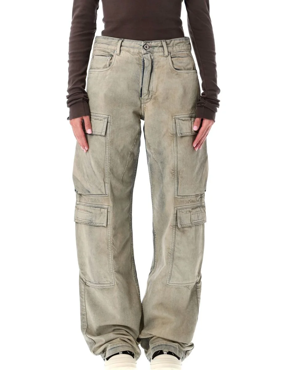 These Rick Owens DRKSHDW cargo pants reinterpret utility style with the brand's signature avant-garde touch. Crafted from faded cotton denim in a relaxed fit, they feature multiple oversized flap pockets along the legs, offering both functionality and bold design. The wide-leg silhouette and washed finish enhance their contemporary streetwear appeal, making them an essential statement piece. Faded grey effect Button and zip front closure Belt loops at waistband Multiple flap cargo pockets Back patch pockets Wide-leg fit Distressed washed finish Alessandra is 1,75 m and wears size 27 Gender: Women Material: 100% COTTON Color: MINERAL PEARL Made in: Italy Product ID: 25ADS02E7308DMP#38 *Import tax/duty will be calculated at checkout (If applicable)