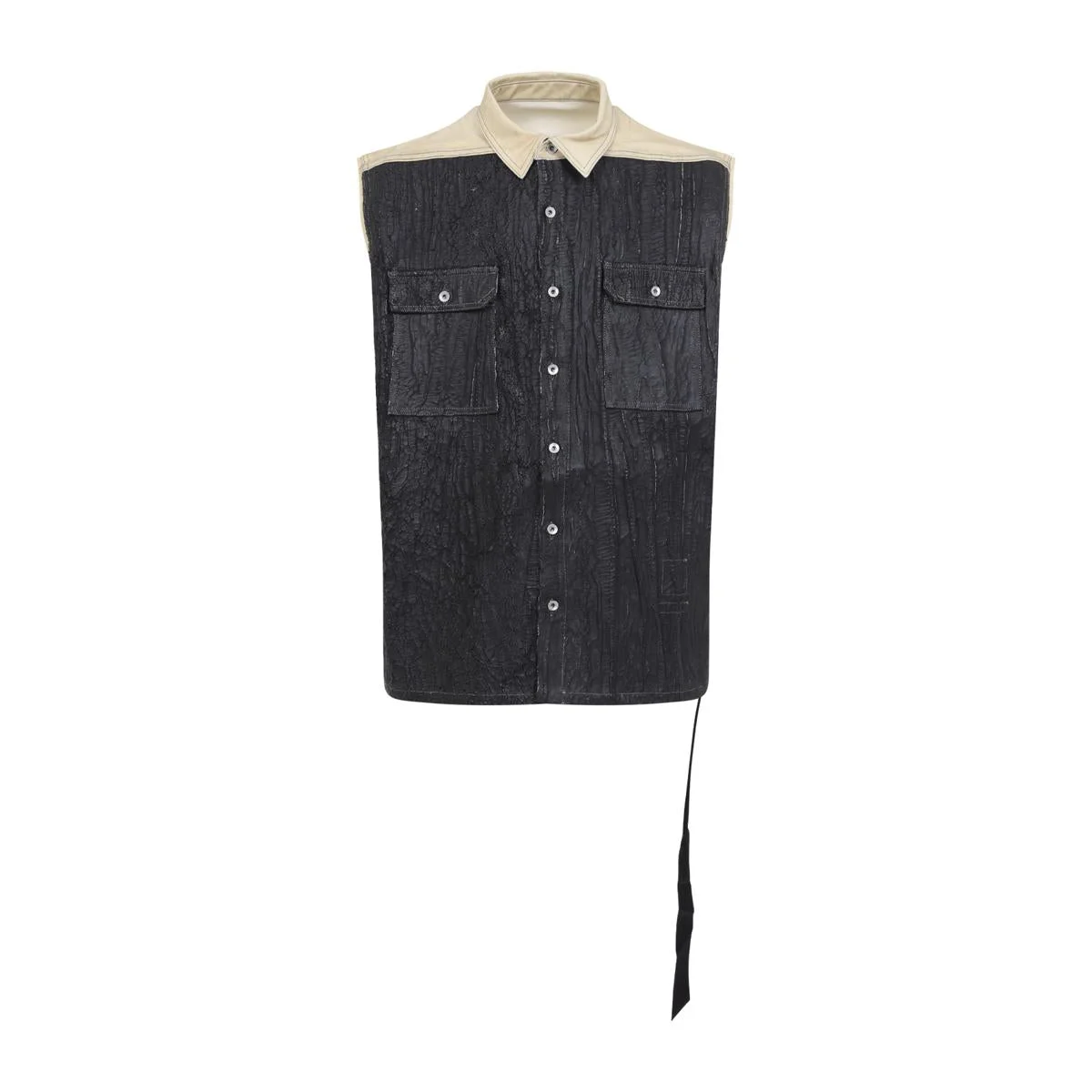 Rick Owens DRKSHDW SL Tommy Jumbo Black Cotton Jacket. Crafted from beige cotton denim, front black craquele effect, pointed collar, front button fastening, two flap pockets on the breast, sleeveless, strap with rivets on the back, long straps detail, straight hem. Gender: Men Material: 100%COTTON Color: Beige Made in: IT Product ID: DU01E3764.DCFCR_8109 *Import tax/duty will be calculated at checkout (If applicable)