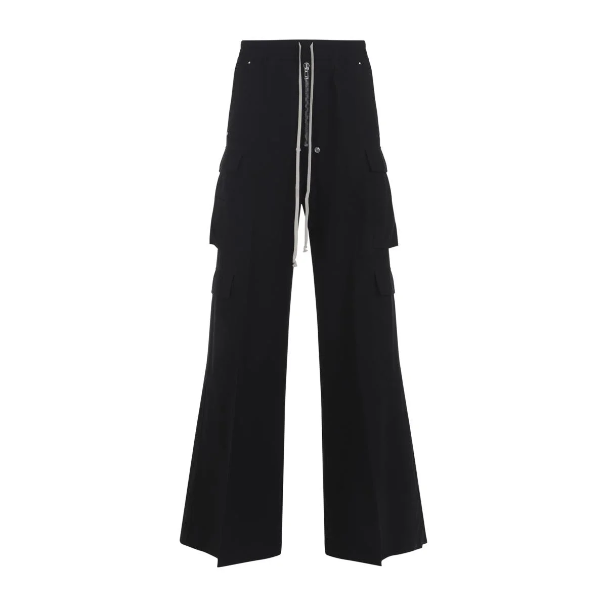 Rick Owen Drkshdw Black Cotton Jumbo Belas Double Cargo Pants. Pure black cotton pants, elastic waistband, front contrasting white drawstring details, front zipped fastening, side pockets, back flap pockets, side cargo pockets, wide flared leg, straight hem, tonal stitching. Gender: Men Material: 100%COTTON Color: Black Made in: Italy Product ID: DU02E7398.CFL_09 *Import tax/duty will be calculated at checkout (If applicable)